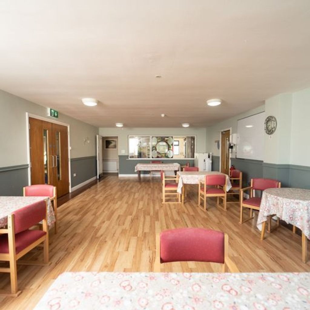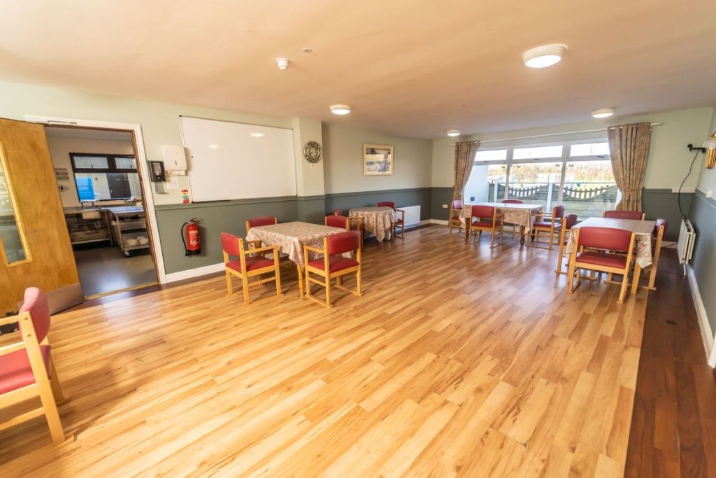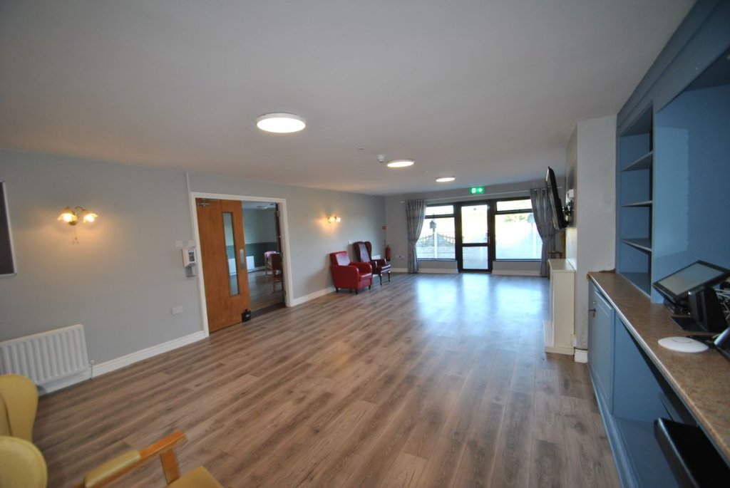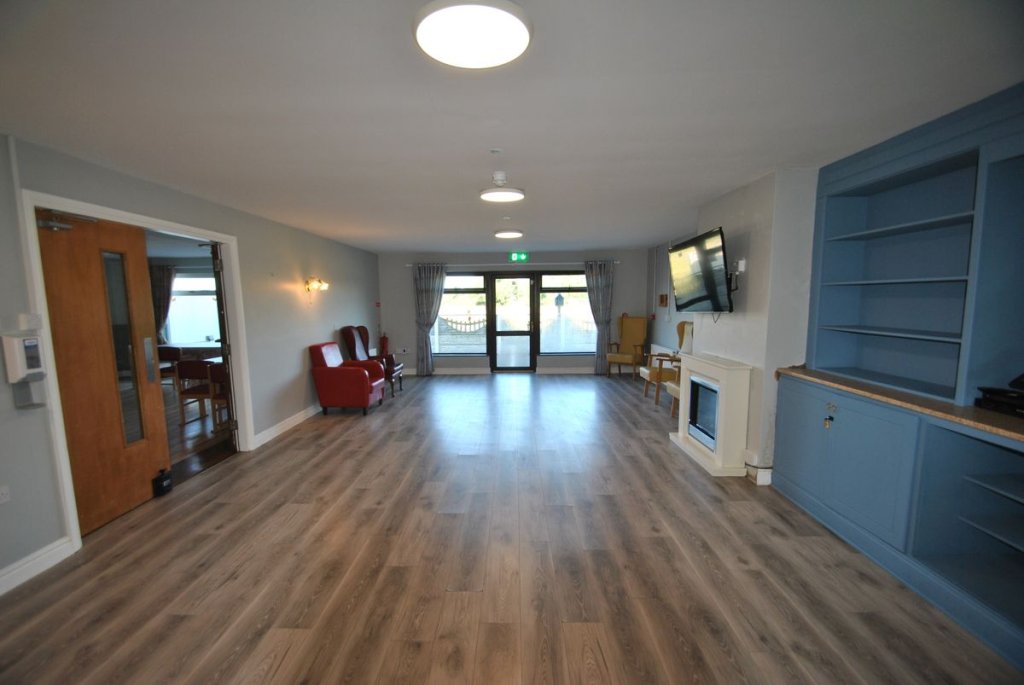 * Communal Lounge/Day Room 5.4m x 10.12m. Extremely bright and spacious communal area with wonderful views overlooking the rear garden and countryside. - Fully fitted out with hospital grade arm chairs, electric effect fire, fitted shelving and wooden flooring. Double doors lead to a lovely outside patio area.
